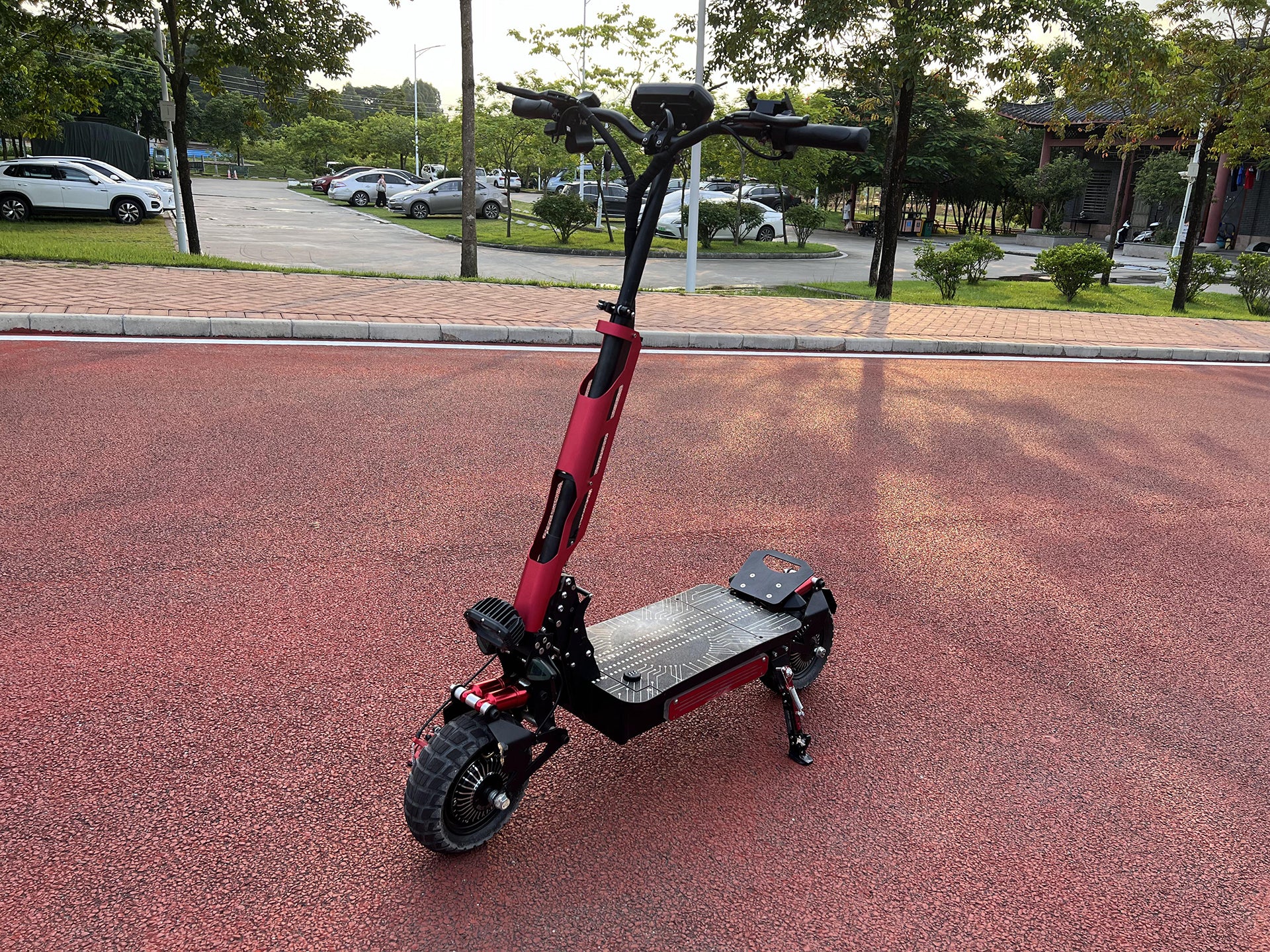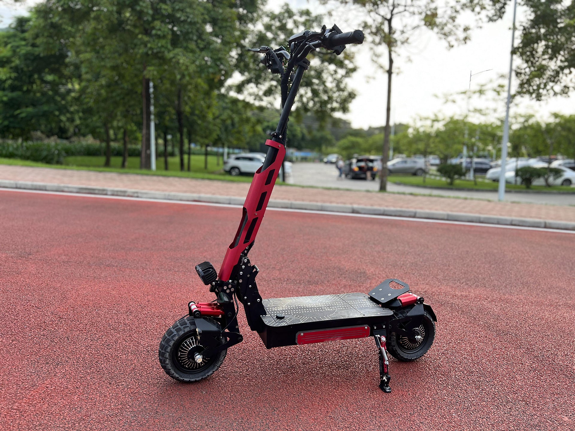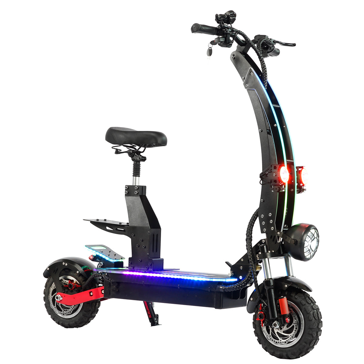 Electric scooter T6 liideway is a very domineering electric scooter with 14inch huge tires, a bottom plate with acrylic panels, and LED light strips. The pole also comes with acrylic panels and LED light strips. Riding at night is very cool, just like a moving flower lamp. Due to the large tires, T6 electric scooter can be suitable for various roads, mountains, snow, grasslands, highways, etc. With powerful power, electric scooter T6 can climb hills, climb stairs, and have a range of over 100km, The feeling when cycling is very comfortable, with excellent oil brakes and hydraulic shock absorbers,